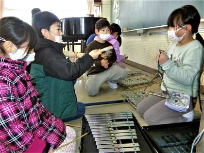 様々な楽器を手にして、星空をイメージした音づくりをする1年生。