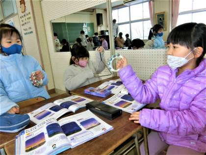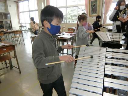 星空を思い描きながら、音づくりを楽しむ1年生。音楽室は、いろいろな楽器の音色でとても賑やかです。