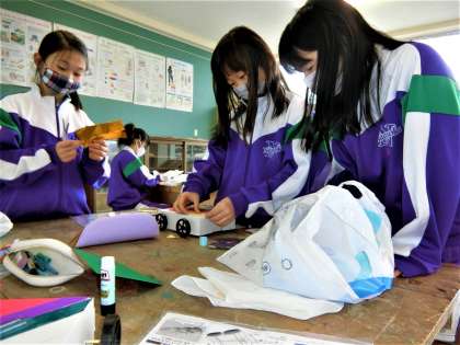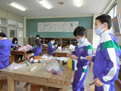 図工室の4年生。友達と情報交換しながら、ドリームカー作りを進めています。