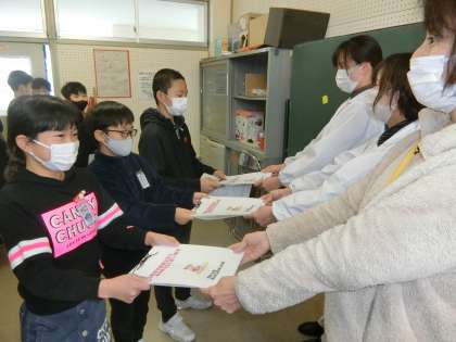 給食週間最終日。放送室で、代表児童が、栄養士さんや調理員さんに感謝の手紙を手渡しました。また、定番の友達リレーも生放送。