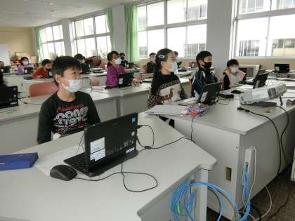 コンピュータ室で、スクリーンに映った映像を見ながら、消防の仕事について学ぶ3年生。