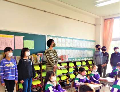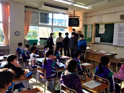 朝活動。6年生は、1年生に、6年間歌ってきた校歌の歌詞とメロディーを教えました。