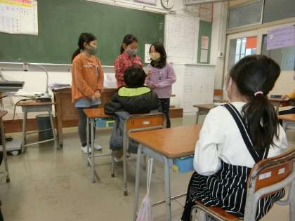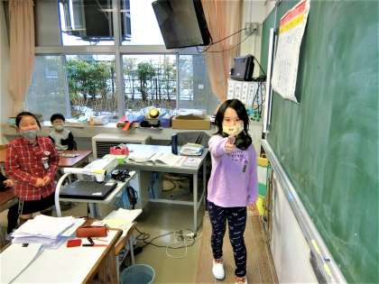 朝の会。係からのお知らせです。「輪ゴムでっぽう的当て大会」の開催を紹介し、競技方法を実演して見せる2年生。
