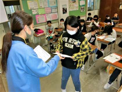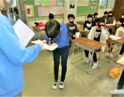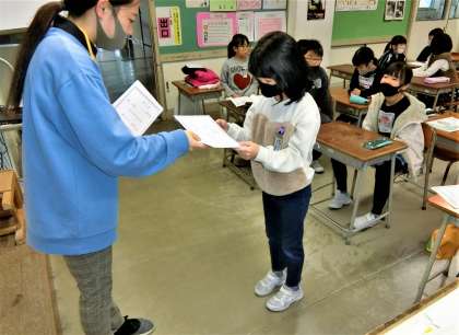 3年生教室。体力つくり「みんなでチャレンジ3015」の達成認定証を手渡しました。