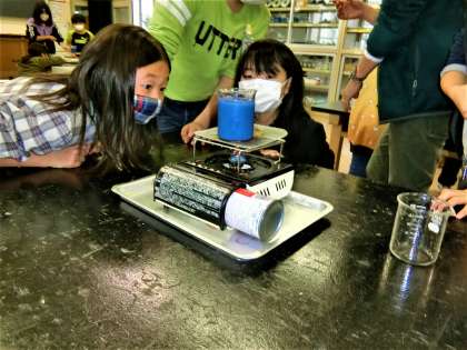 高温になると、青から桃色に変色する示温インク。4年生は、色の変化を見逃すまいと一生懸命です。
