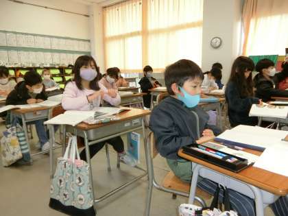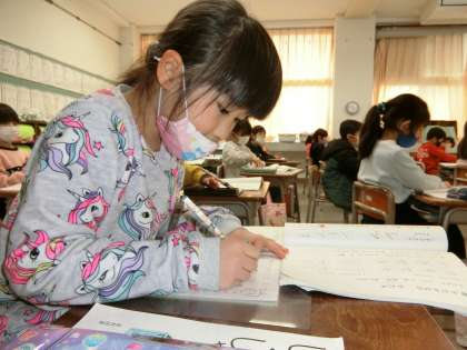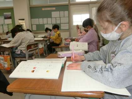朝から国語の学習に打ち込む1年生。平仮名に片仮名、漢字も書けるようになりました。