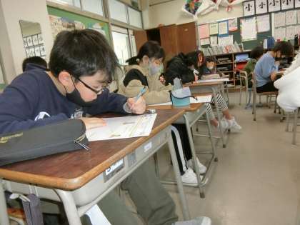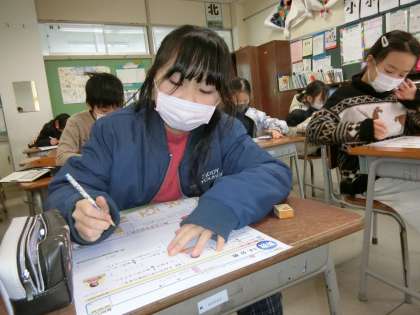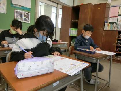 算数の時間に学んだ分数。今日は、学んできたことを思い起こしながら問題に答えています。