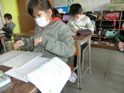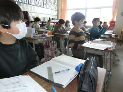 算数の時間。1平方センチメートルの幾つ分で面積を求めることを学んでいるところです。