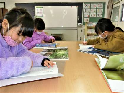 図書室で国語科の学習をする1年生。動物の赤ちゃんについて調べています。