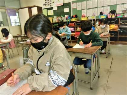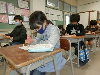 2年生教室。かけ算九九をすばやく正確に想起するトレーニングをしています。