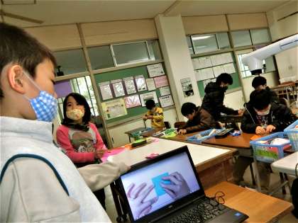 おもちゃづくりを進める2年生。パソコンで動画を検索して作り方を調べる子もいます。