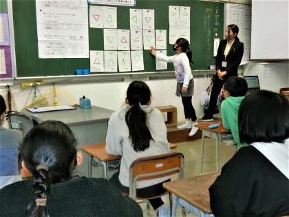 3年生は、グループごとに数種類の三角形をつくり、辺の長さに注目しながら仲間分けする学習をしました。