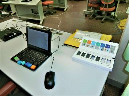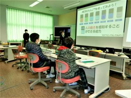 6年生。富山市教育センターから3名の講師をお招きし、さまざまな機能をもった小さな「電子タグ」MESH(メッシュ)を活用して、プログラミングを学びました。