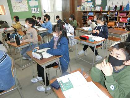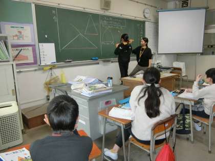 3年生教室。算数の時間。今日は、コンパスで長さを測り取って正三角形をかく学習を展開中。