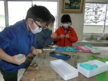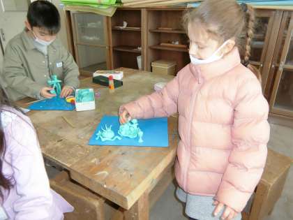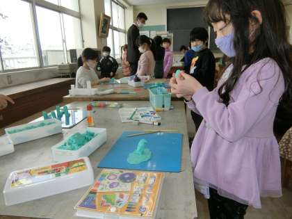 図工室の1年生。粘土で造形活動を楽しんでいます。