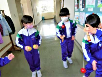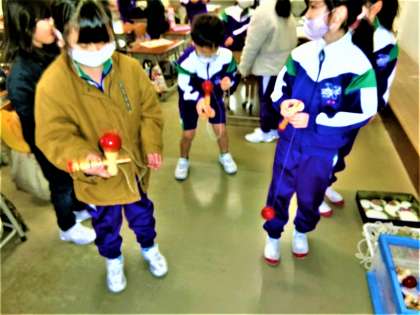 剣玉やお手玉で遊ぶ1年生。教室は、とても賑やかです。