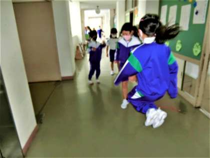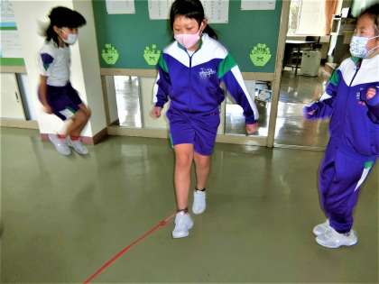 縄跳び遊びで、楽しく体を温める2年生。
