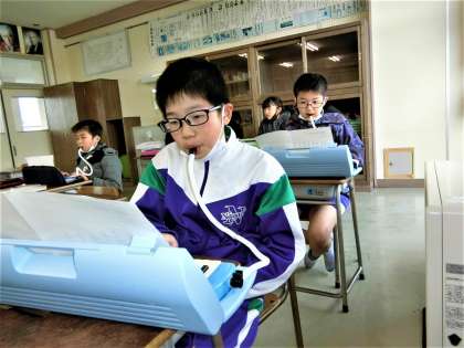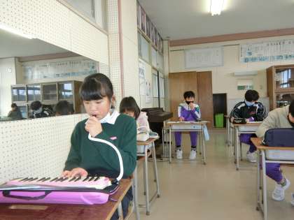 音楽室の6年生。今日の学習内容は、作曲。鍵盤ハーモニカで音を出しながら、オリジナル曲を創造しています。