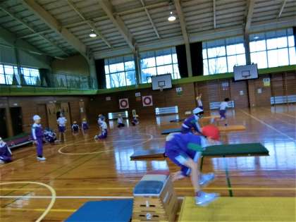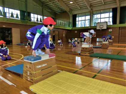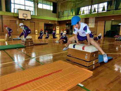 ジャンプ、手をつく、跳び越える・・・というイメージで跳び箱運動にチャレンジ。