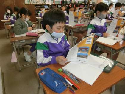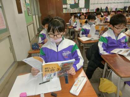 社会科の学習。消防の仕事に携わる方々の願い、努力、工夫・・・について学ぶ3年生。