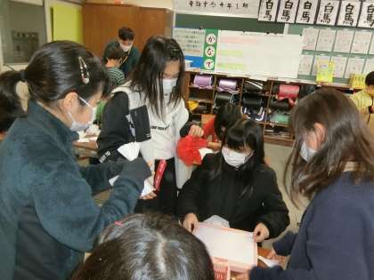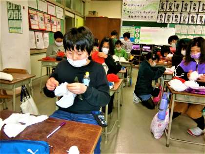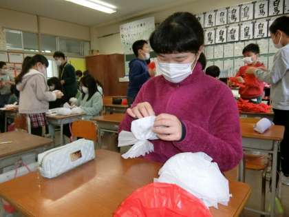 卒業を祝う週間の準備を進める4年生。手際よく花の飾りを作っています。