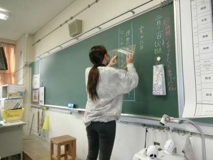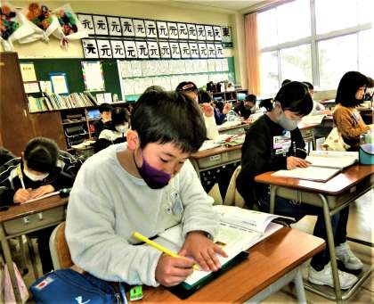 3年生。国語の授業開始。まずは、学習課題をノートに書きました。