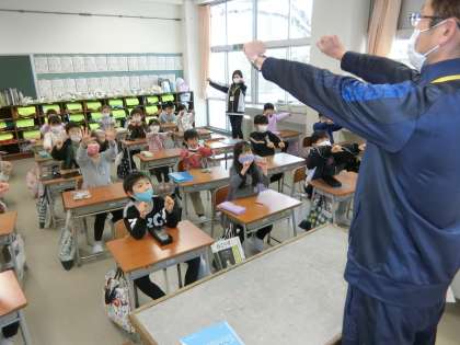 1年生。準備運動をして、これから書写の学習を始めるところです。