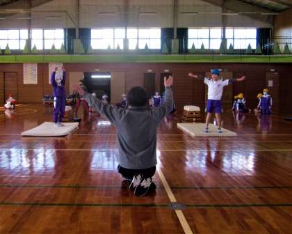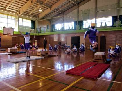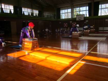 跳び箱に対する抵抗を和らげるために、スモールステップで学習を進めています。