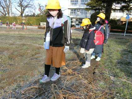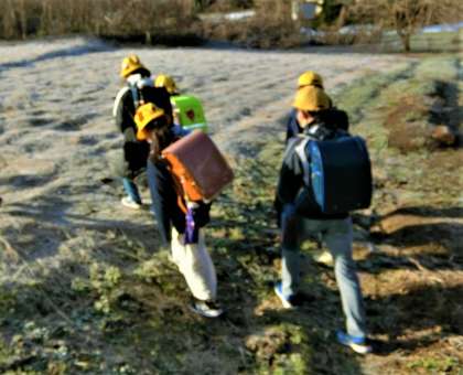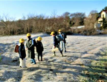 放射冷却のおかげで、霜が降りました。子供たちに、霜柱の感触を楽しんでもらいました。