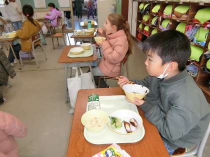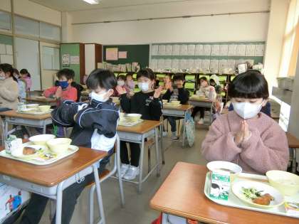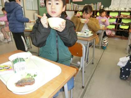 今日の献立は、ちらし寿司、揚げ魚、おひたし、すまし汁、ひなあられ、牛乳です。ごちそうさまです。