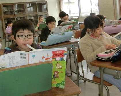 音楽室で、「こいぬのマーチ」を合奏する1年生。