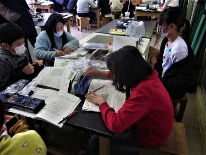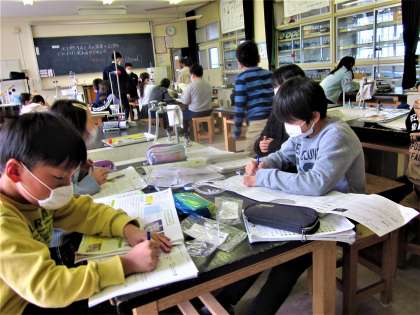理科室の4年生。水を温めて沸騰させ、そのときの水温を調べました。