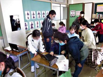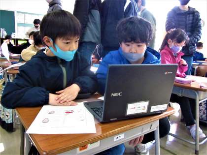 1年生は、6年生など上級生の支援を得て、パソコンにパスワードを設定しました。
