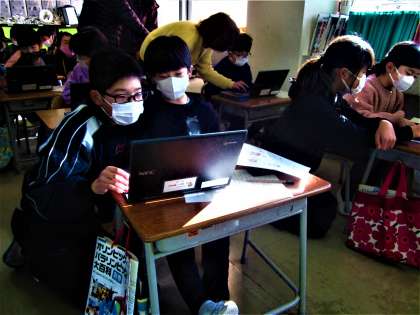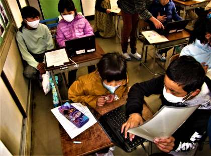 朝活動の時間。6年生インストラクターが、1年生のパソコンの設定をサポートしました。