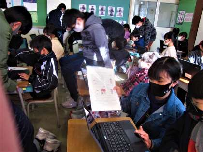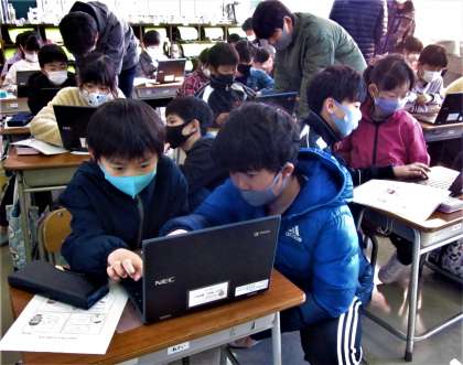 既に自分のパソコンの設定を終えている6年生。1年生の身になって、親切・丁寧に作業を進めていきます。