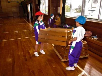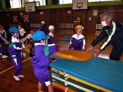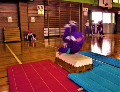 台上前転にもチャレンジ。準備や後片付けの協力体制もパーフェクトです。