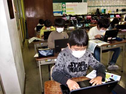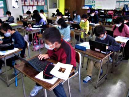 パソコンの機能を生かして、クラス全員の考えを共通理解する4年生。黒板に一つ一つ書く手間や時間が省けます。