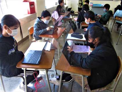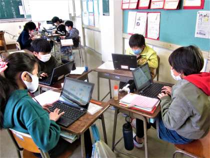 自分用パソコンで、グループ会議をする4年生。