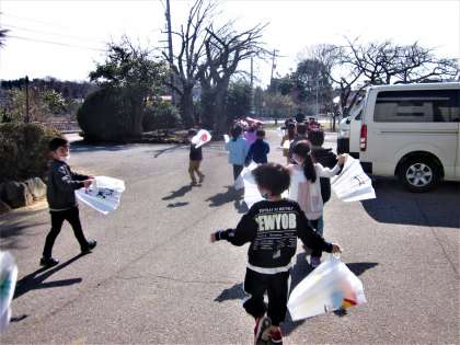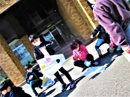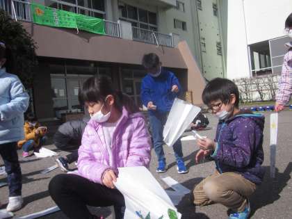1年生は、自作した凧を手に外に出てきました。中には、「この凧、本当に上がるのか心配。」という子もいます。