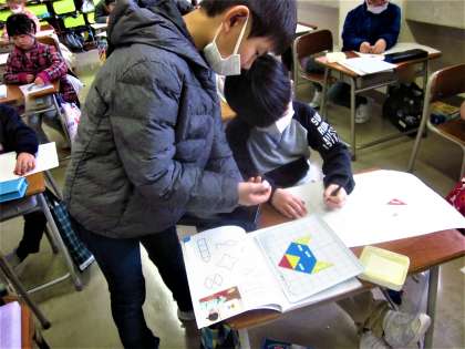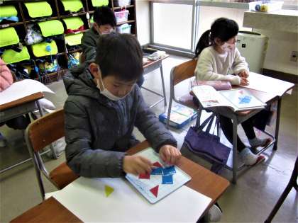 1年生の算数の学習。色板をならべながら、「三角」や「四角」などの形について学んでいます。