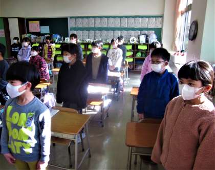 1年生。朝、卒業式で歌う国歌の練習をしました。