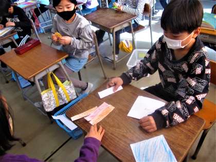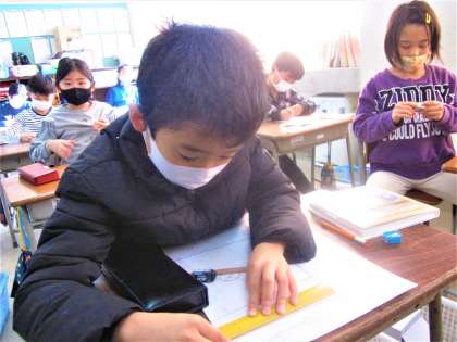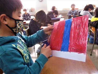 写し取った箱の面に色をつけたり面を切り取ったりしながら、箱の構成を調べる2年生。