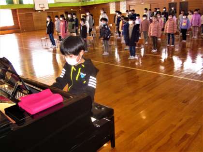 在校生代表として、卒業式の式場に入る5年生。存在感があります。