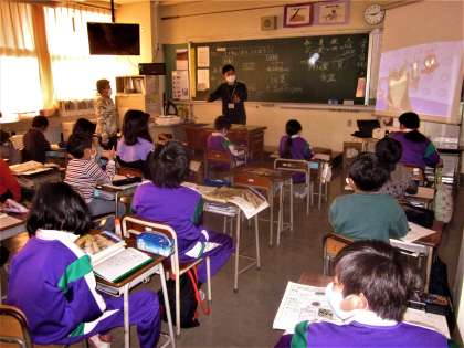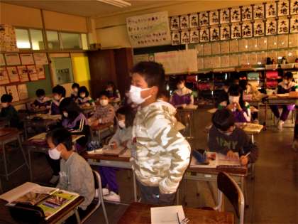 サクラやヒキガエルの映像を視聴しながら、生き物の冬越しについて学ぶ4年生。