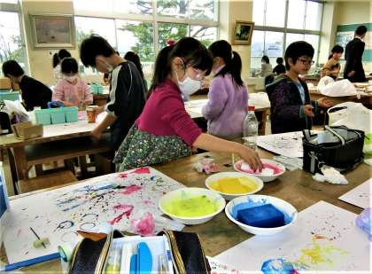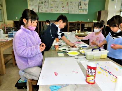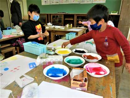 図工室で、スタンプや転がしで色遊びを楽しむ1年生。