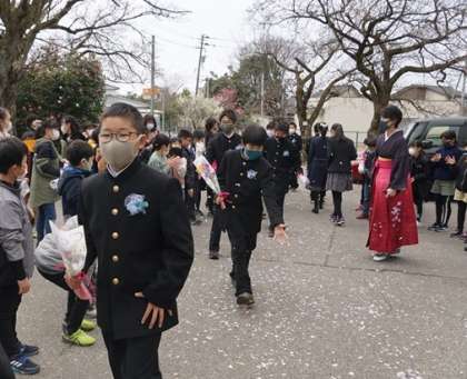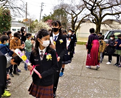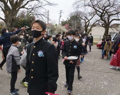 在校生に祝福され、卒業生、照れくさそうに門出。