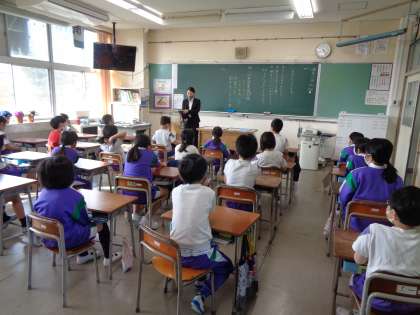 先生と目をつないで話を聞いている子が多く、こちらも中学年の自覚が感じられます。