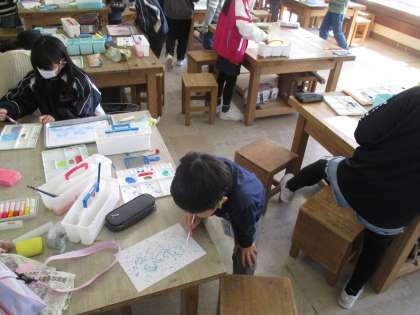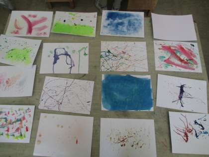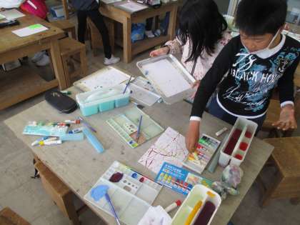 ブラシと金網、ビー玉、スポンジなど、いろいろなものを使ってすてきな模様を作りました。