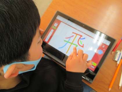 パソコンで漢字のなぞり書きを行っています。大きな文字で何度も書けるので、とても便利です。たくさん漢字を覚えましょう。