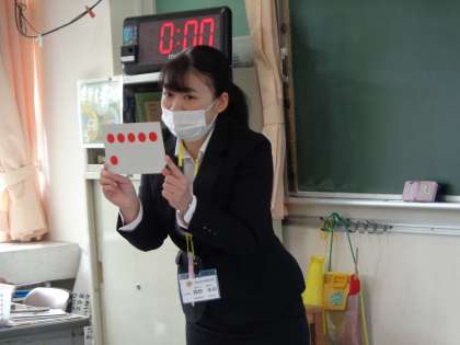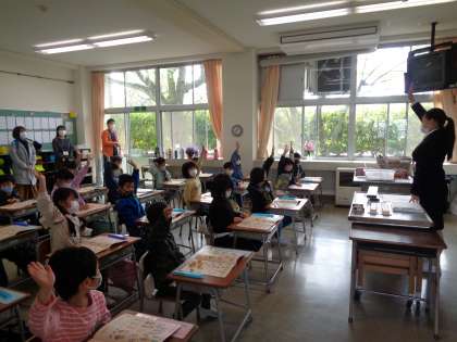 算数科「なかまづくりとかず」の学習でした。多くの目の中での学習で、始めはかなり緊張していたようです。